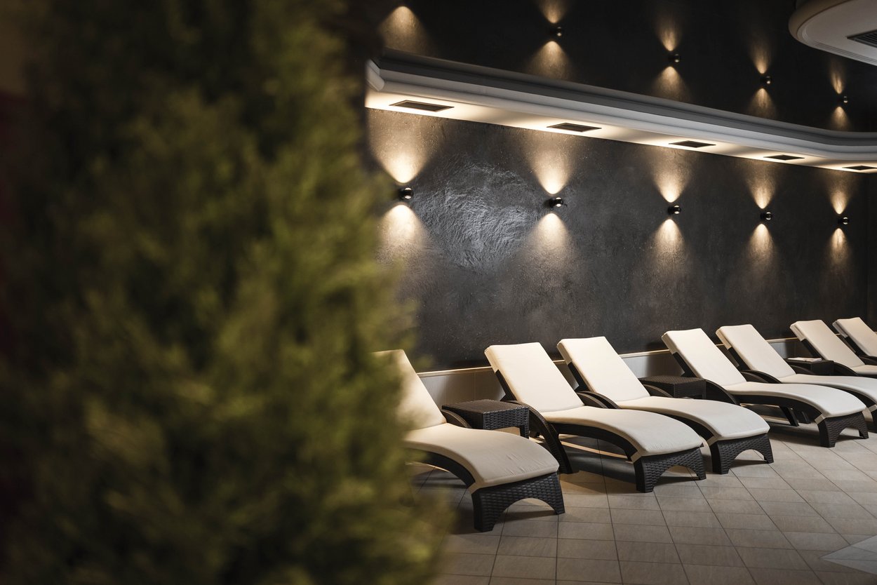 Doppelzimmer im Erdgeschoss mit privater Terrasse, Sonnenliege und -schirm, Sitzgelegenheit, SAT-TV, Radio, Safe, Telefon, WLAN, Minibar, Klimaanlage, Badezimmer mit Dusche, Bidet, WC, Haartrockner und Kosmetikspiegel, Wellnesstasche mit Bademantel, Sauna- und Badetüchern sowie Badepantoffeln.